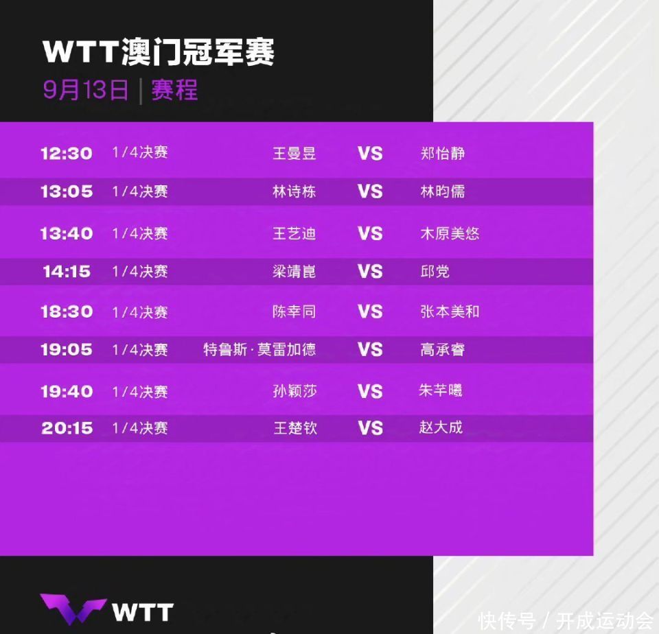 WTT澳门冠军赛2024年9月13日赛程出炉,也即是1/4决赛对阵表簇新出炉。中午场,由央视CCTV5+接收性直播,咪咕体育付费直播。其中,日乒男队防微杜渐,日乒女队还剩两东谈主,齐是国乒VS日乒值得眷注,王艺迪VS木原好意思悠,陈幸同VS张本好意思和。